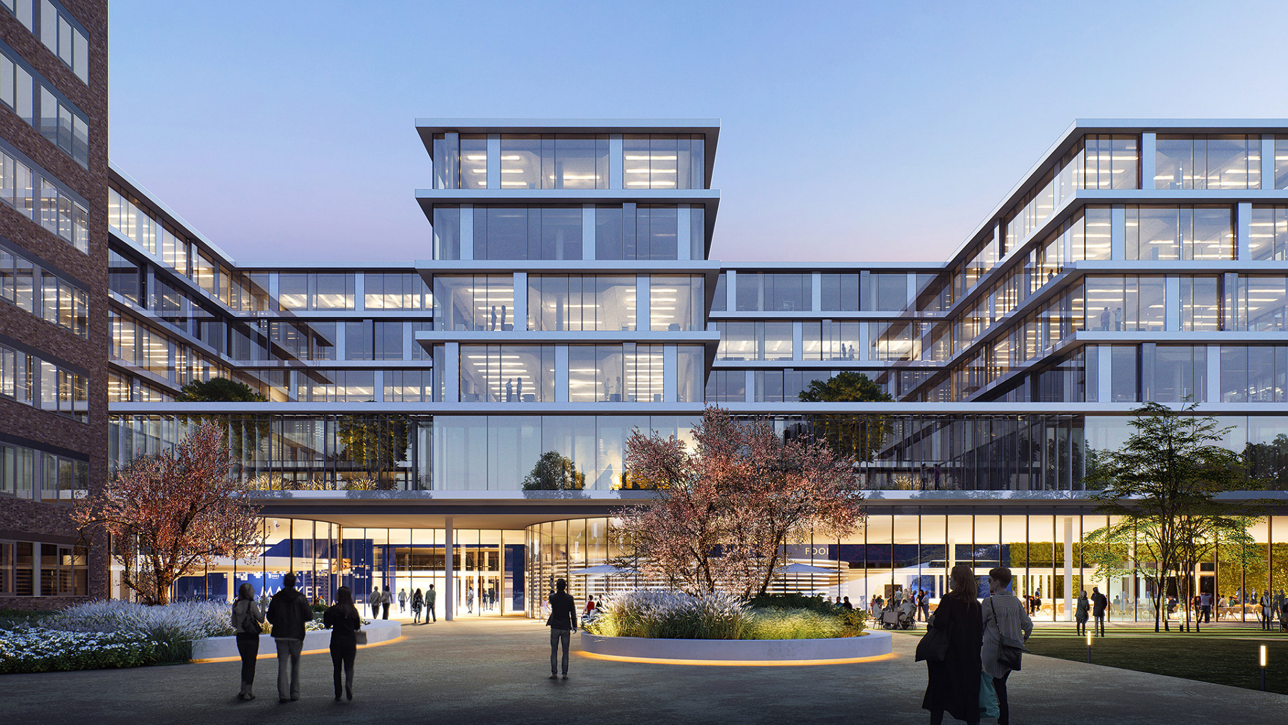 Fünf Personen unterhalten sich vor einem Beiersdorf-Logo.
